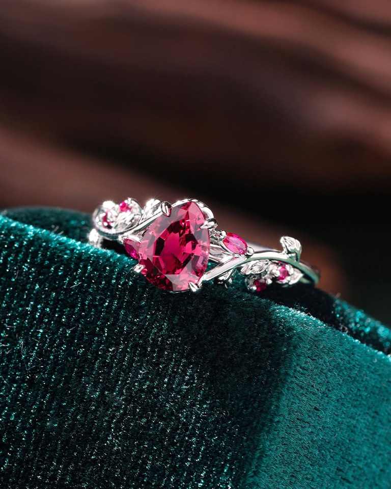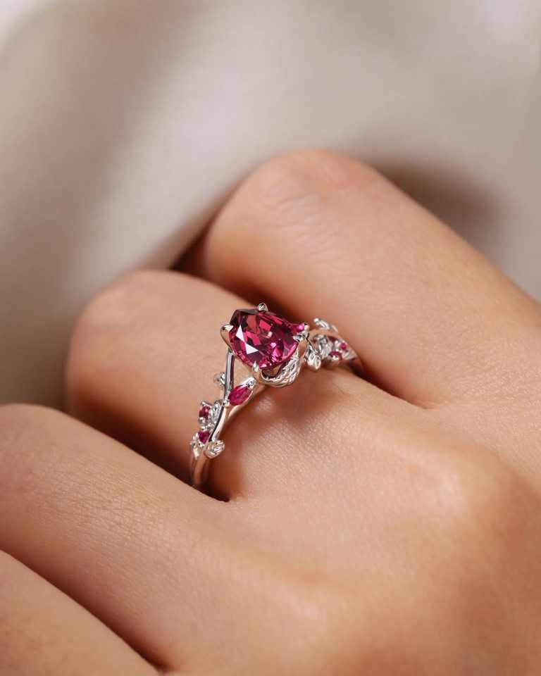 แหวนหมั้นรูปหัวใจทับทิมสีแดง เงินแท้ 925 แหวนใบไม้สัญลักษณ์แห่งความรักสำหรับเธอ ทับทิม 8 มม. แหวนผู้หญิง
