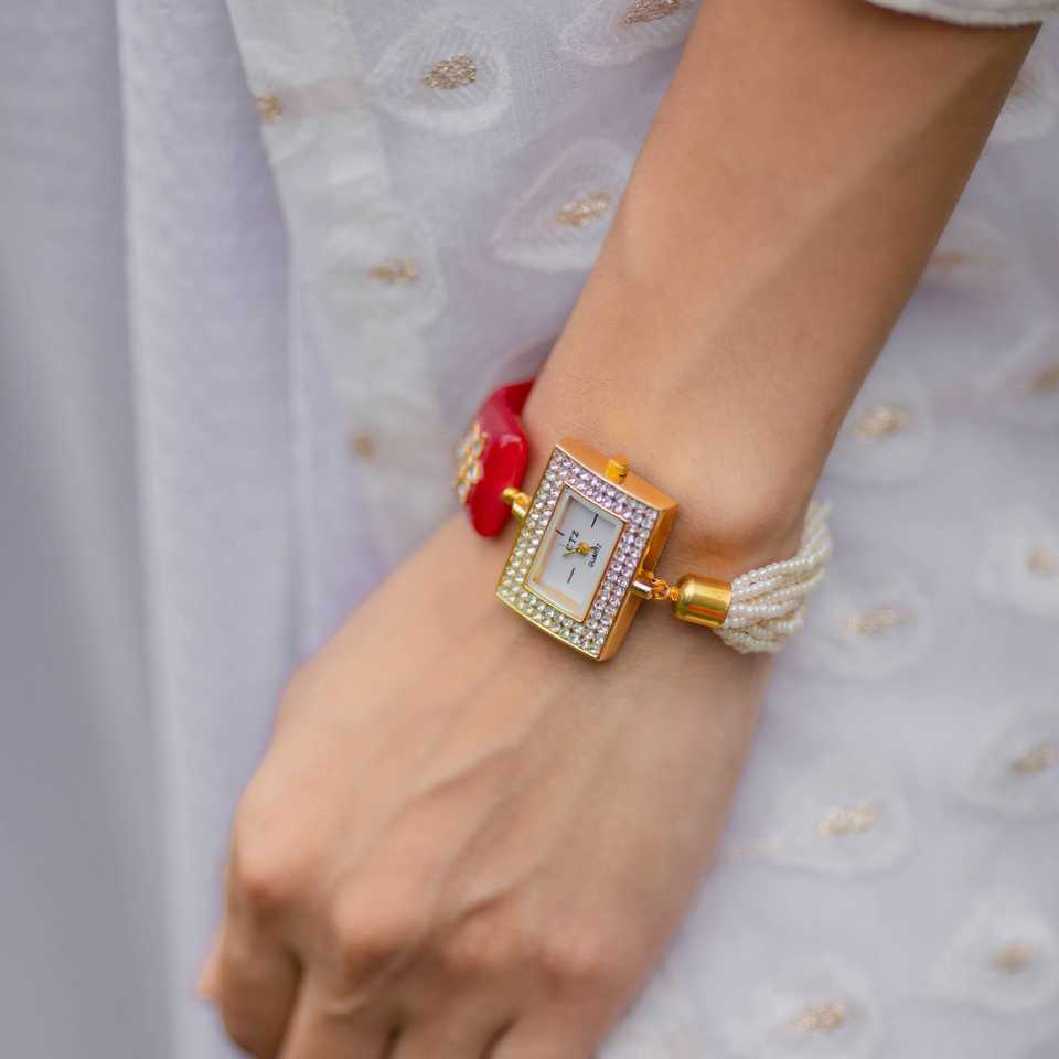 ตกแต่งสร้อยข้อมือแบบดั้งเดิมนาฬิกาหินสีแดง kundan ลูกปัดและมุกพู่สำหรับผู้หญิงชาติพันธุ์เทศกาล rakhi และของขวัญเครื่องประดับ