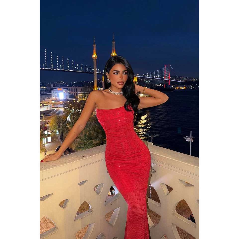ชุดราตรีสีแดงแบบไร้สายรัดไหล่ ทรงเอ็มไพร์ ยาวประดับคริสตัล เหมาะสำหรับงานเลี้ยงหรืองานคืนสู่เหย้า มีไซส์ XS ถึง XL ความยาวระดับพื้น