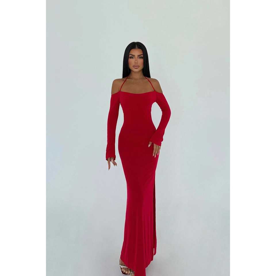ชุดราตรีสีแดงแบบผูกโบว์ แขนยาว ประดับเลื่อม ทรงเอ็มไพร์ เอวสูง เหมาะสำหรับงานแต่งงาน งานเลี้ยง งานปาร์ตี้ ยาวกรอมพื้น