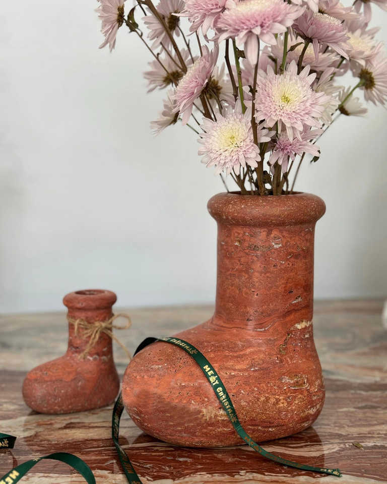 รองเท้าหินทราเวอร์ทีนสีแดง ของตกแต่งบ้านทำมือ รูปปั้นรองเท้าดีไซน์ไม่ซ้ำใคร ของสะสมสุดหรู ของขวัญสุดพิเศษ