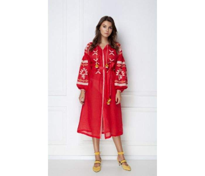 ชุดเดรสคลุมเข่าปักลายดอกไม้ยูเครนสีแดงแขนยาวสไตล์ยุโรปดีไซน์เนอร์ความยาวน่องชุดปาร์ตี้ชายหาดคริสต์มาสอื่นๆ