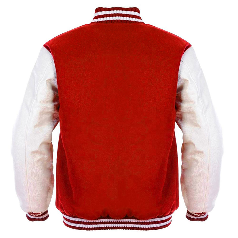 แจ็กเก็ตกำมะหยี่ปักลายตัวอักษรผ้าวูลสีแดงและขาวแขนเสื้อหนัง