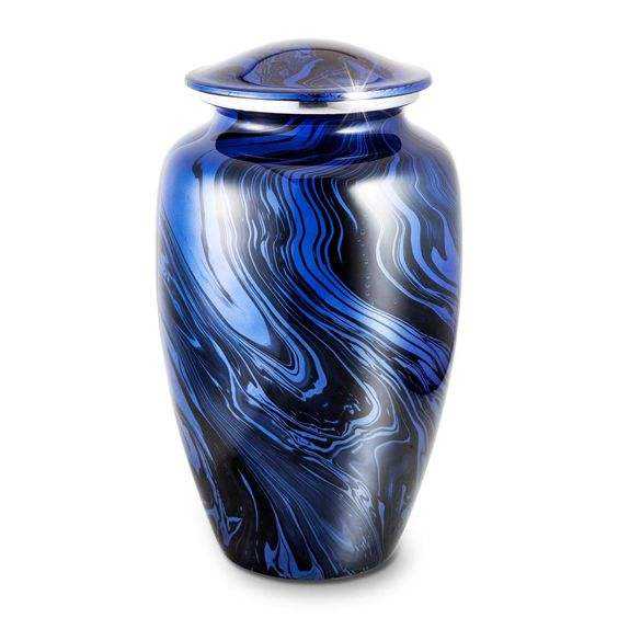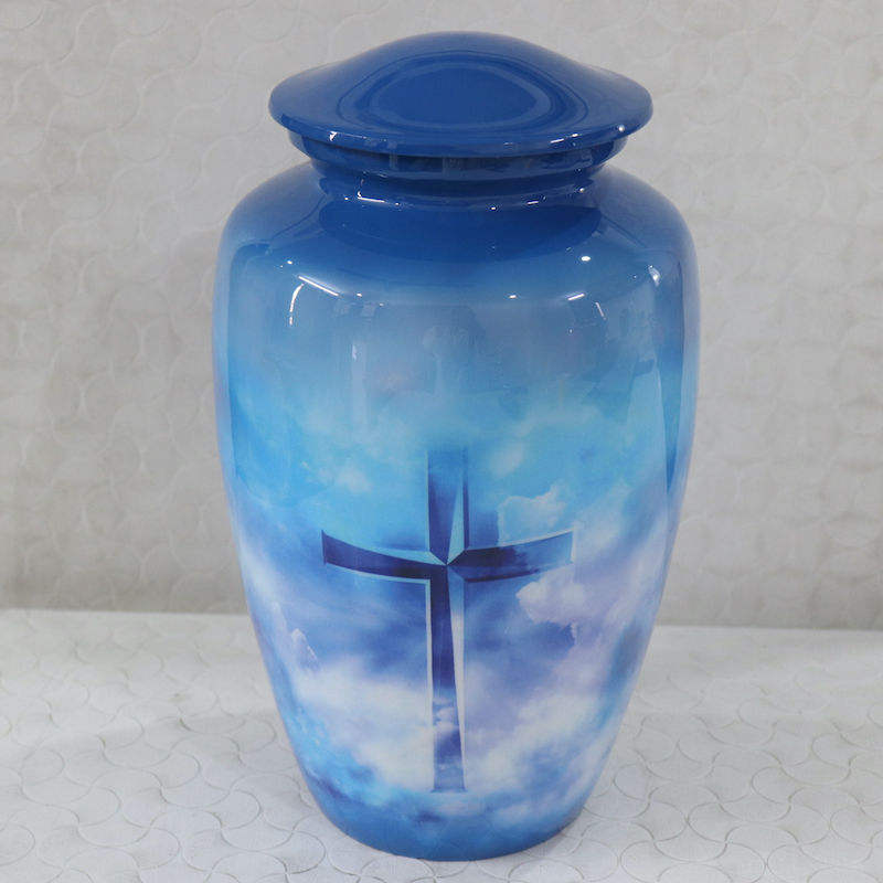 โกศบรรจุอัฐิสีแดง ขาว และน้ำเงิน ลายดาวเด่นชัด พร้อมถุงกำมะหยี่สำหรับเกียรติยศและอนุสรณ์