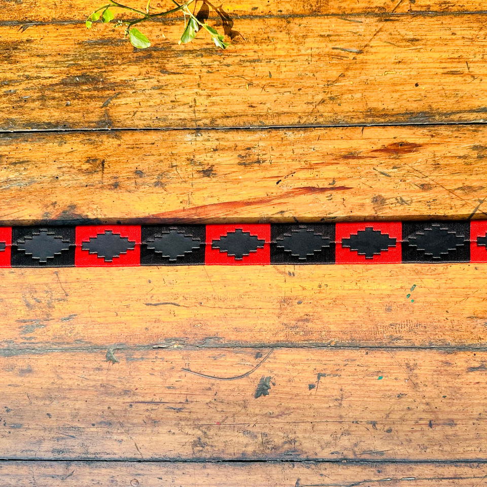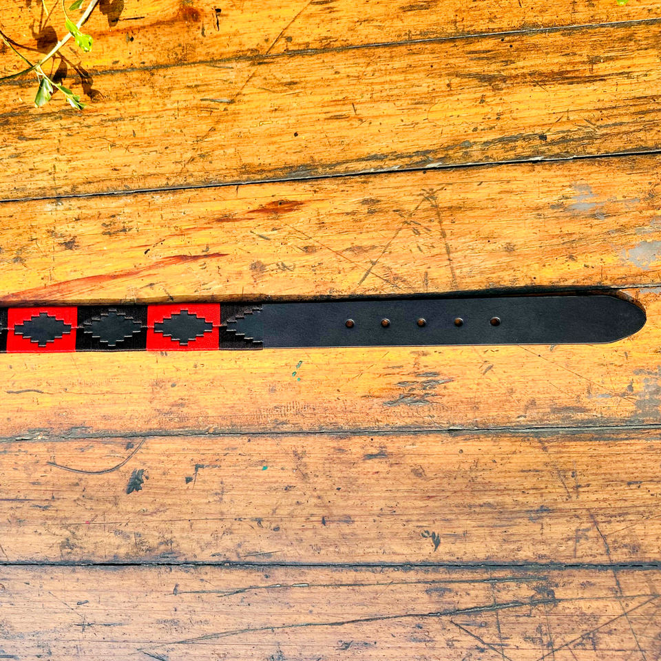 เข็มขัดหนังโปโลสำหรับเยาวชนสีแดงและสีดำส่องประกายพร้อมหนังควายน้ำกว้าง35มม. ใช้ได้ทั้งชายและหญิง