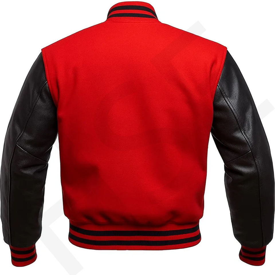 แจ็คเก็ตสีแดงและสีดำ-แจ็คเก็ตเบสบอลวิทยาลัยขนสัตว์และหนังคลาสสิก