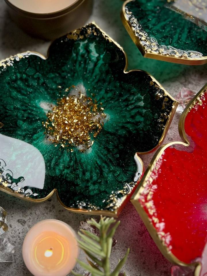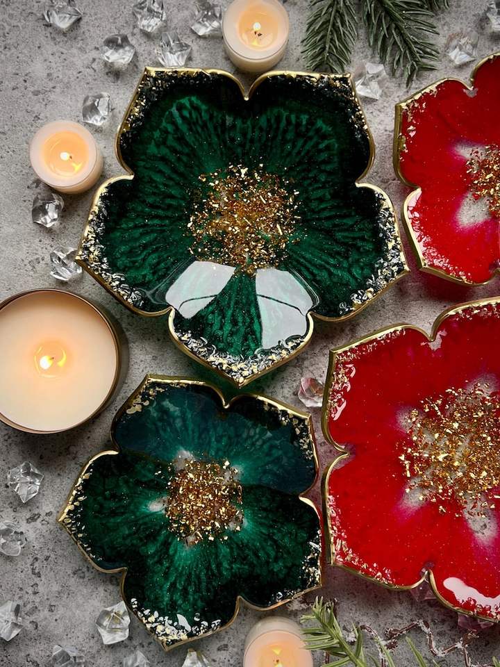 ชามดอกไม้เรซิ่นสีแดงและสีเขียว, จานอีพ็อกซี่ตกแต่ง, เม็ดสีเรซิ่นอีพ็อกซี่, ทองคำเปลว