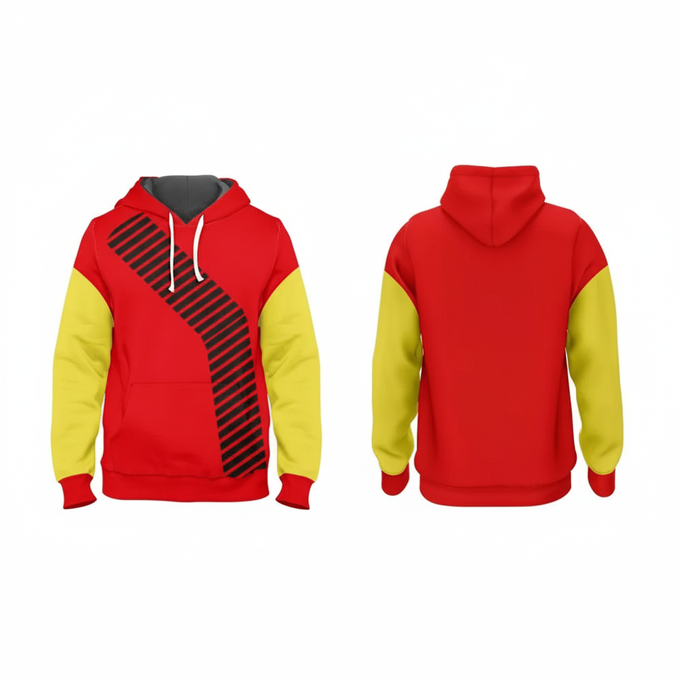 เสื้อมีฮู้ดลำลองแบบสวมหัวมีลายทางสีดำมีสไตล์สีแดงและสีเหลือง