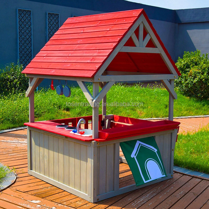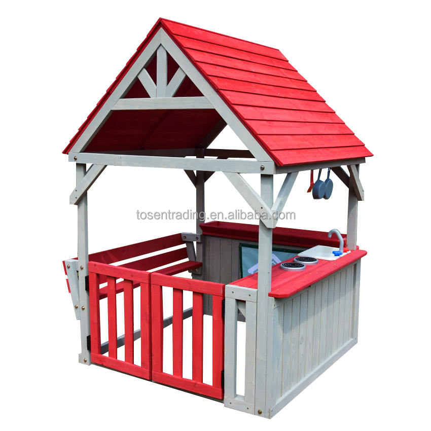 ครัวไม้สีแดงสำหรับเล่นกลางแจ้งพร้อมม้านั่งปรับเปลี่ยนได้ หลังคาสีแดง อ่างล้างจาน และเตาจำลอง - บ้านเด็กเล่นในสวนหลังบ้าน