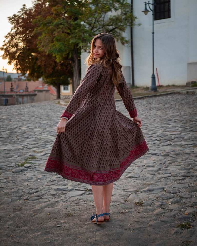 ชุดเดรสผ้าฝ้ายลายดอกไม้รีน่า สีน้ำตาลอมเทา สีแดงเลือดหมู ทำด้วยมือ