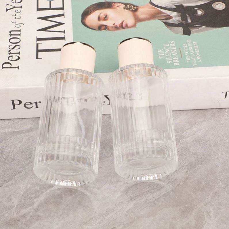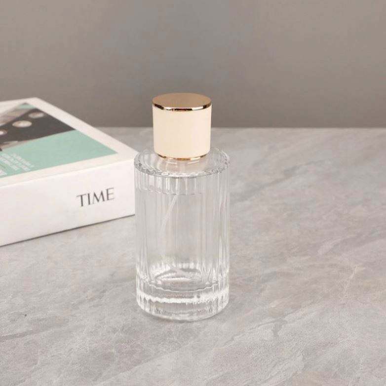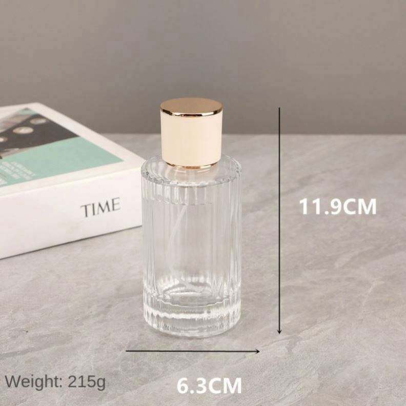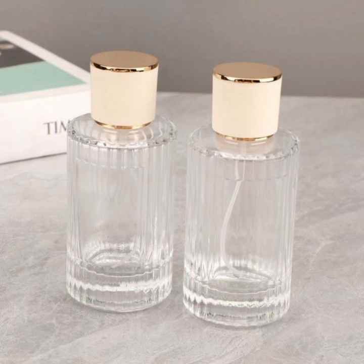 ขวดน้ำหอมแก้วทรงกระบอกใสหรูหราขนาด 100 มล. แบบเติมได้ ปรับแต่งได้ พิมพ์ลายซิลค์สกรีน พร้อมหัวฉีดสเปรย์ รับผลิตแบบ OEM แบรนด์ของคุณเอง รวดเร็ว