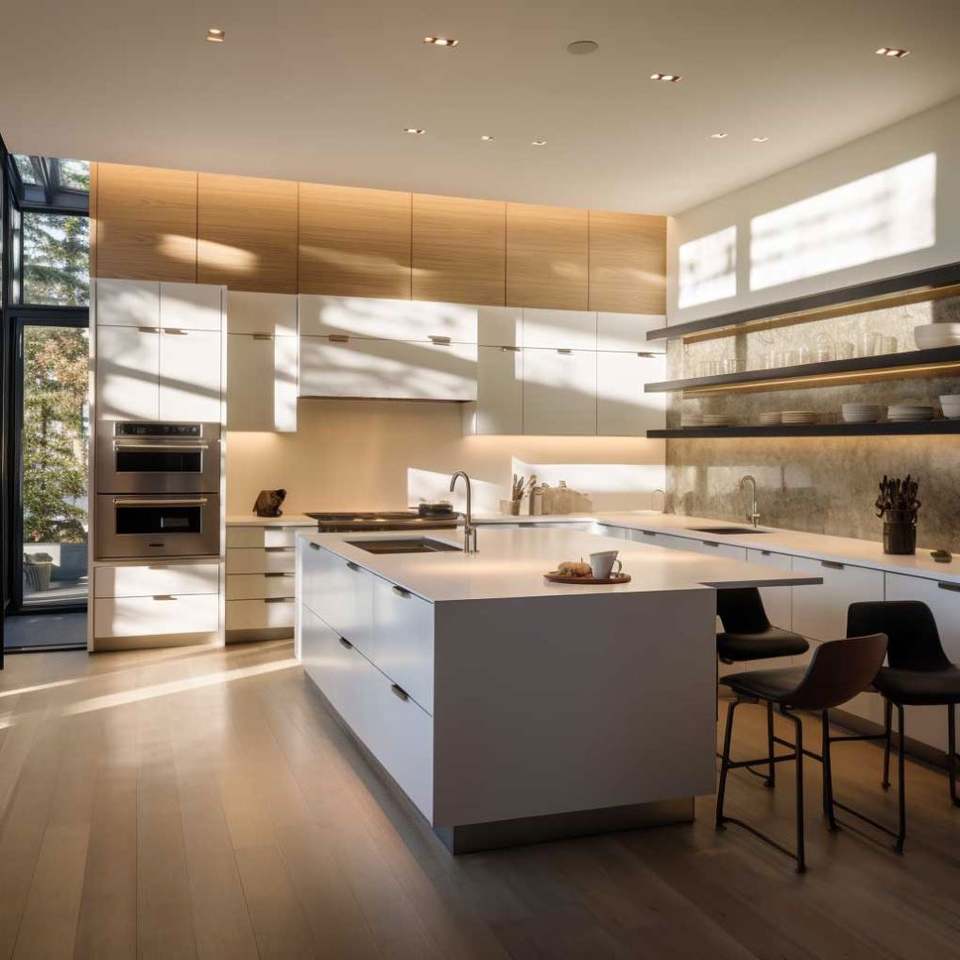 ห้องห้องครัวแบบแยกส่วนรูปตัวยูที่สวยงามสวยงามทันสมัยพร้อมเกาะที่น่าดึงดูด