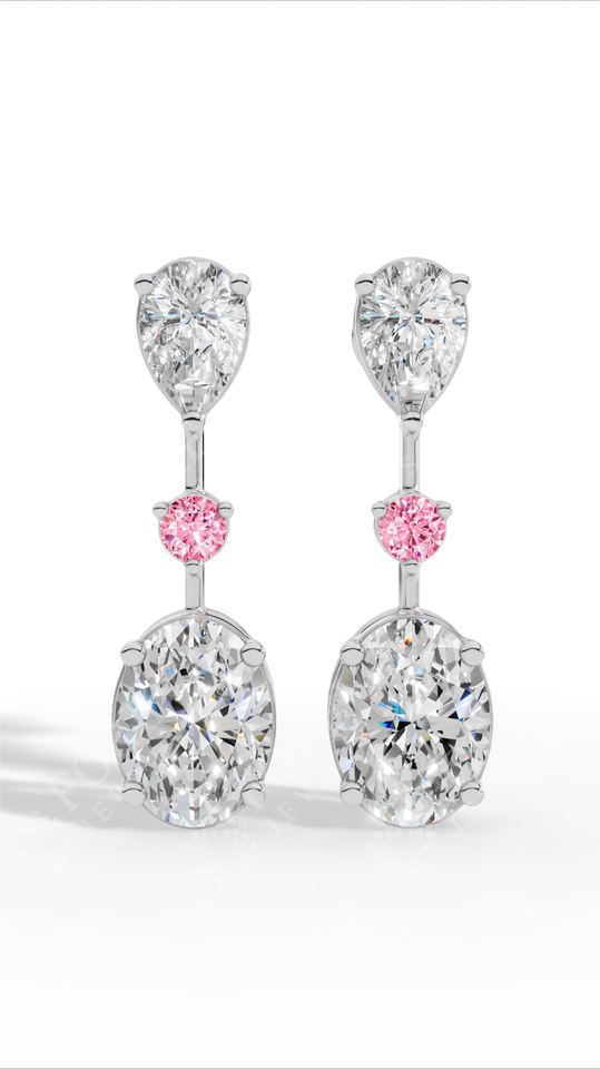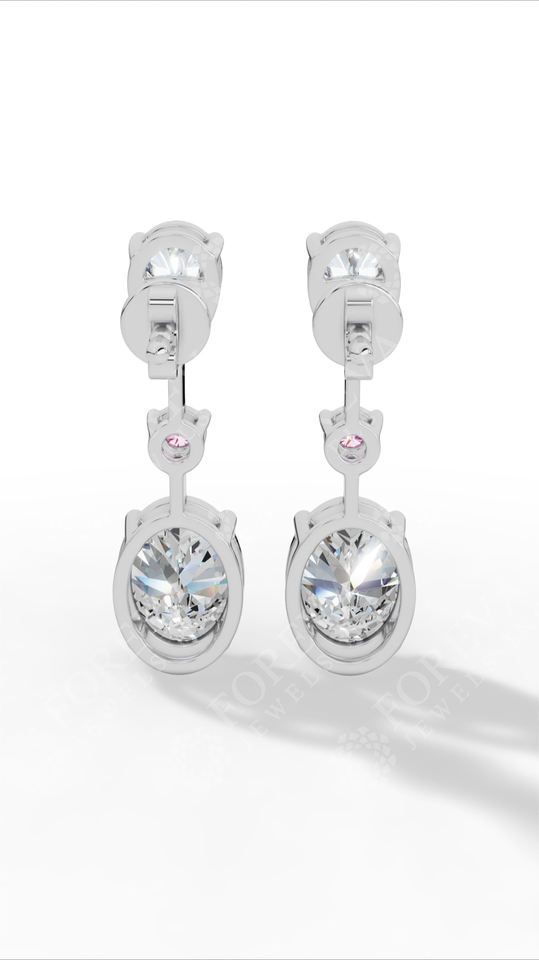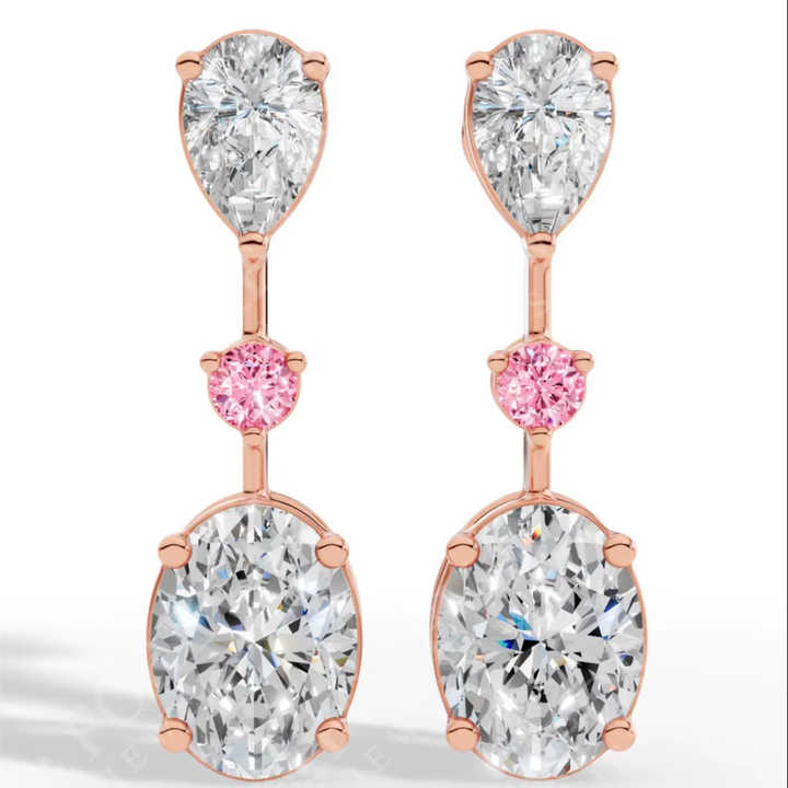 ต่างหูห้อยทรงเสน่ห์สองชั้นประดับด้วยพลอยรูปทรงกลมและวงรีสีชมพูพีร์ร์ ผสมผสานกันอย่างลงตัว ทอง 14K ผู้จัดจำหน่ายเครื่องประดับหรูหราคุณภาพสูง