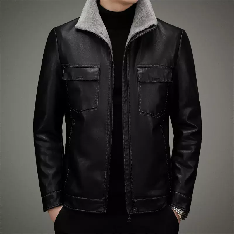 แจ็กเก็ตสไตล์สากลสำหรับผู้ชายหนังหรูหราใช้งานได้จริงสวมใส่สบายคลาสพร้อมคอตั้งผ้าแคนวาส