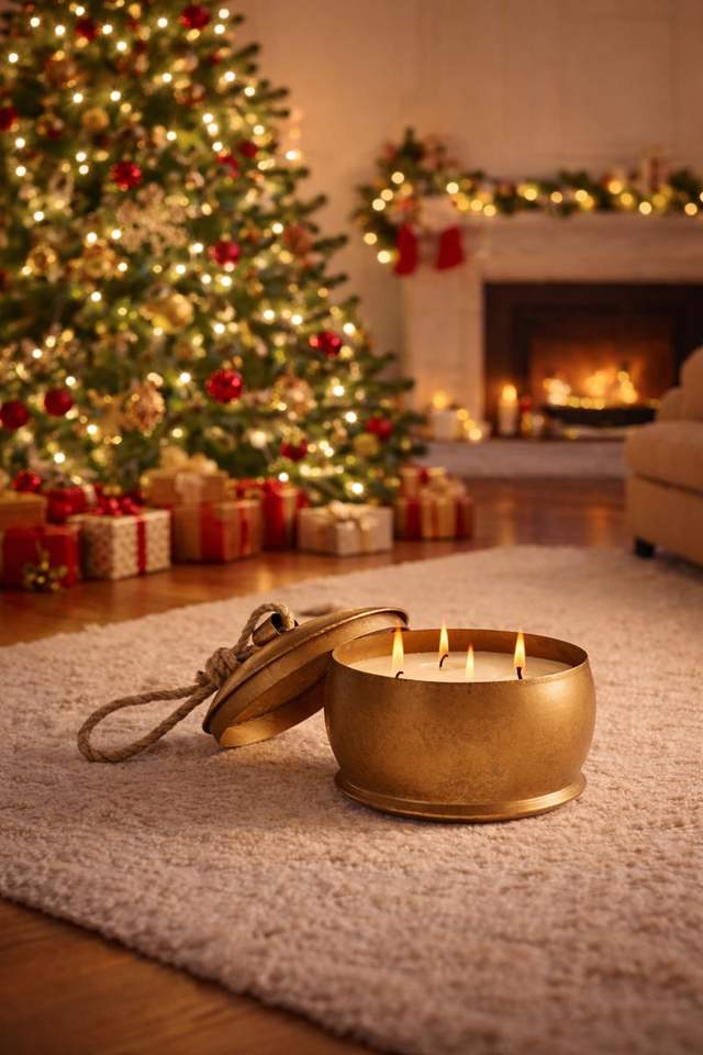 โถเทียนโลหะขัดเงาพร้อมฝาปิดลายปม ไส้เทียนสามเส้น เปล่งแสงสว่าง ให้ความรู้สึกอบอุ่น สร้างบรรยากาศหรูหราในบ้าน