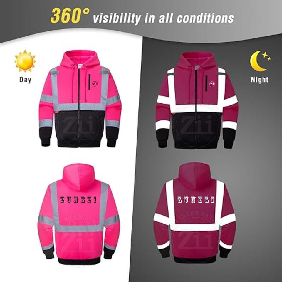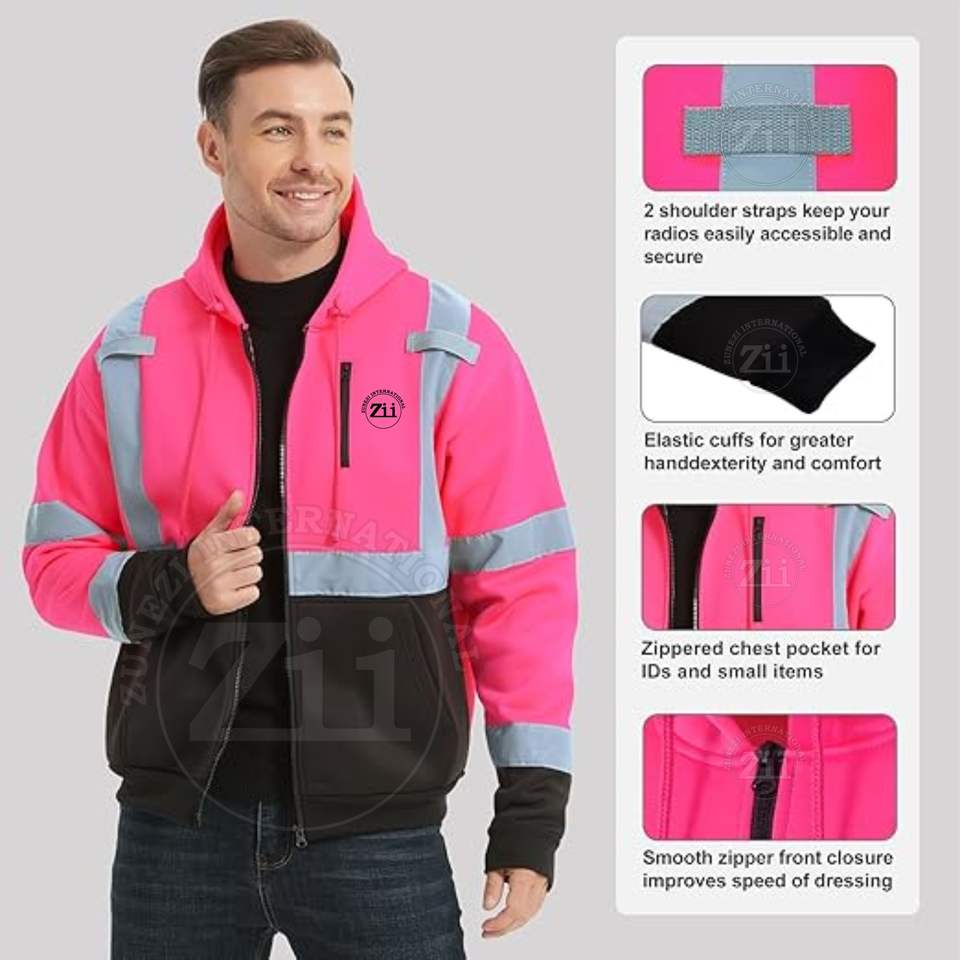 แจ็กเก็ตสะท้อนแสงสะท้อนแสงเรืองแสงเพื่อความปลอดภัยในงานก่อสร้างฤดูหนาวชุดสีชมพูสะท้อนแสงจากโรงงานสีดำ