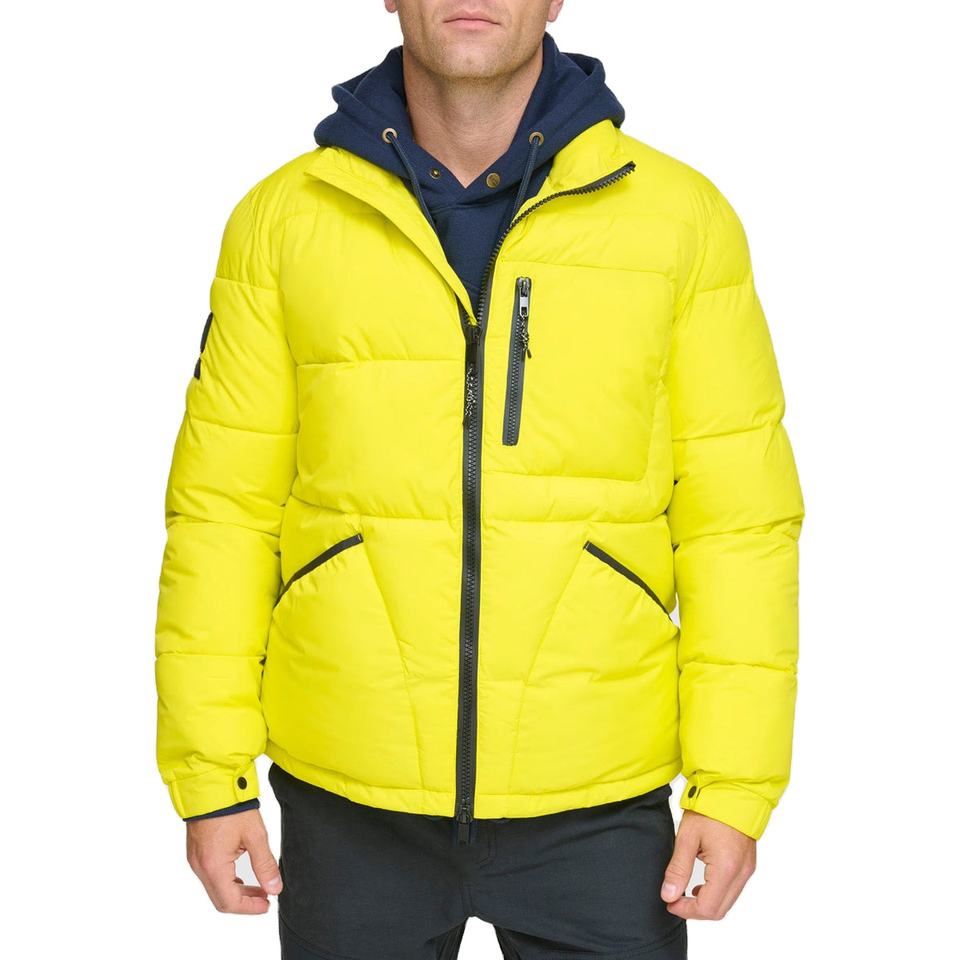 เสื้อแจ็คเก็ตบุใยกันหนาวสำหรับผู้ชายแบบมีฮู้ด คอตั้ง สะท้อนแสง มองเห็นได้ชัดในเวลากลางคืน พร้อมโลโก้ด้านหน้า