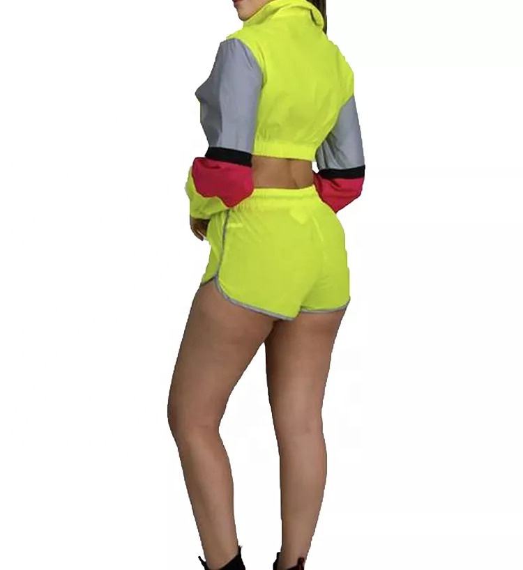 ชุดเสื้อแจ็คเก็ตและกางเกงขาสั้นของผู้หญิง,ชุดเสื้อครอปและกางเกงขาสั้นแถบสีมีซิปด้านหน้าสะท้อนแสงปี2022
