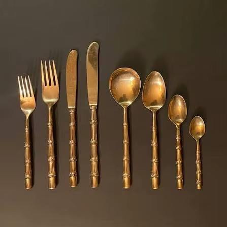 ชุดช้อนส้อมทองเหลืองขัดเงาที่มีประกายสะท้อนแสงช่วยเพิ่มความสวยงามในการเสิร์ฟอาหาร ทำให้อาหารดูน่ารับประทานยิ่งขึ้น