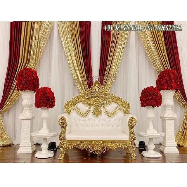 โซฟาแต่งงานสีขาวทองหรูหรา สไตล์ฮินดูแบบราชวงศ์ โซฟาสองที่นั่ง โซฟาแกะสลักด้วยมือสไตล์โมเดิร์นสำหรับเจ้าบ่าวเจ้าสาว สวิตเซอร์แลนด์