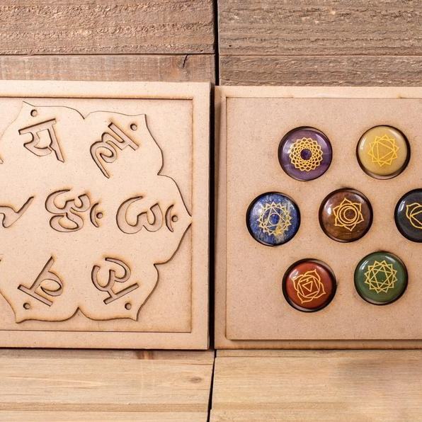 ชุดคริสตัลจักระ7ชิ้นพร้อมกล่องไม้ OM Namaste สันสกฤตหินขัดเงาสำหรับความรักและการตกแต่งทางจิตวิญญาณ