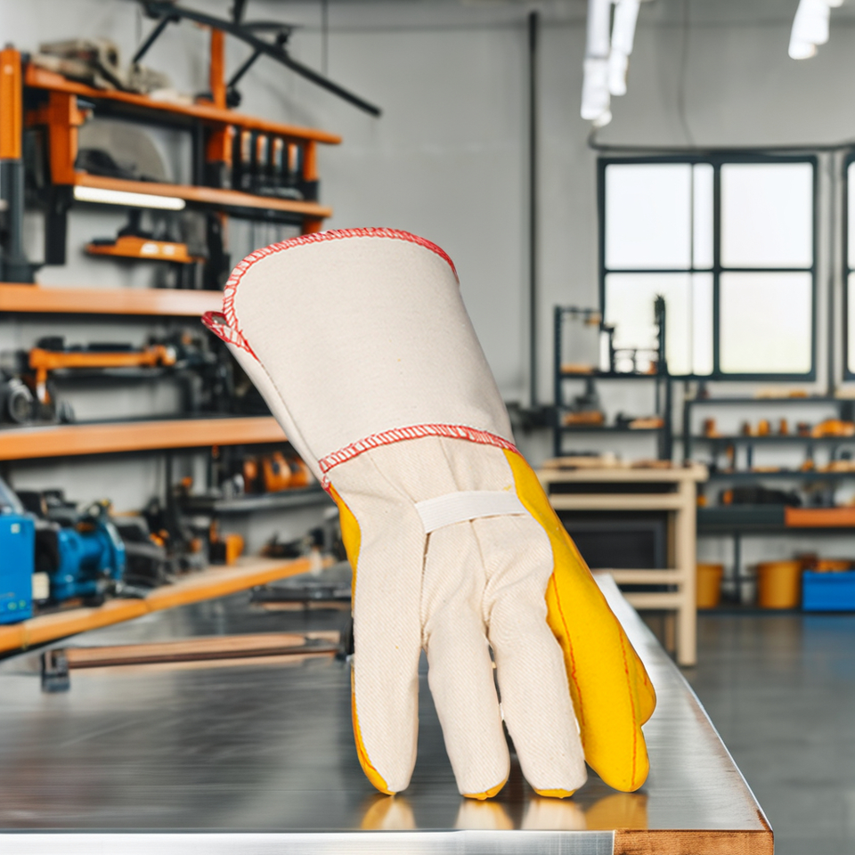 ถุงมือทำงานกันน้ำแบบเสริมแรง โพลีเอสเตอร์ 24 ออนซ์ ป้องกันการบาด ทนทาน ฝ่ามือสีเหลือง ปลายแขนยางยาวแบบเรียว