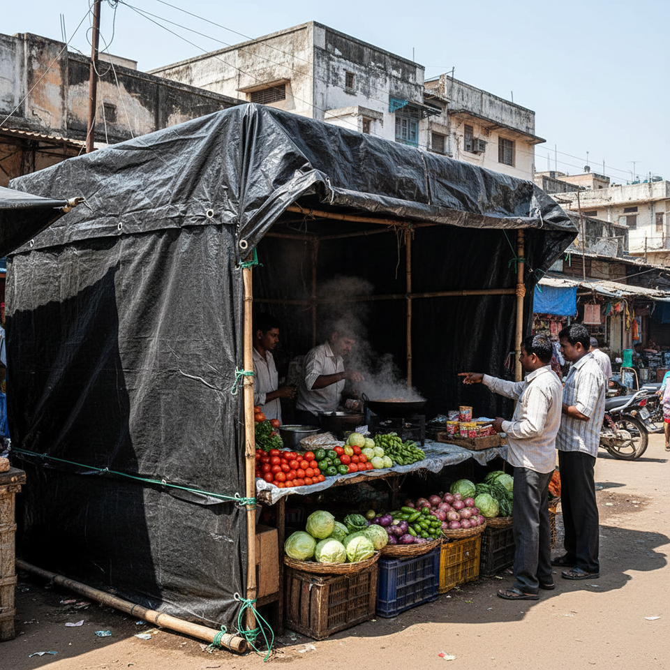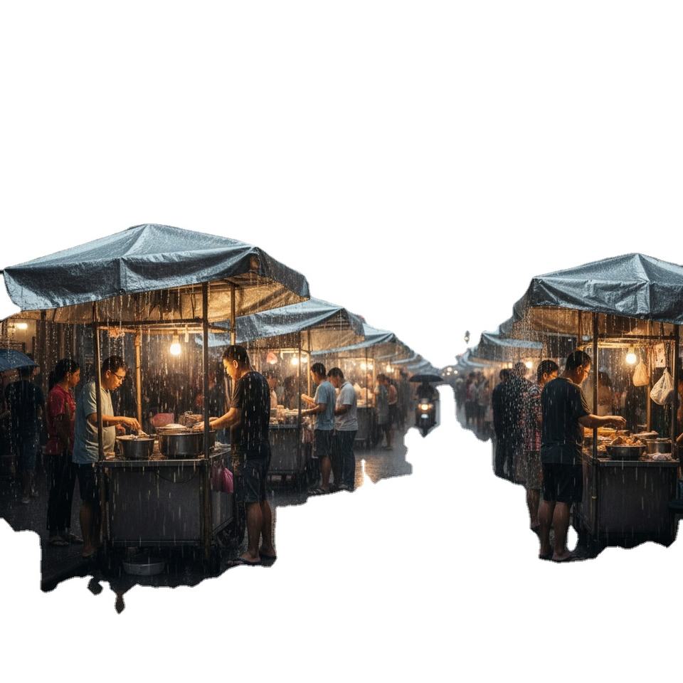 ผ้าใบกันน้ำสำหรับแผงลอยขายของกลางแจ้ง Reinforced Edge Hawker แบบเคลือบสองชั้น ผ้าใบตลาด Hawker ชนิด PVC แข็งแรงทนทาน แบบม้วน
