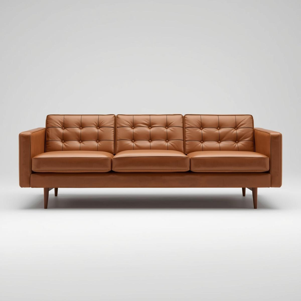 โซฟาหนังคอนยัคสไตล์มิดเซ็นจูรี่ พนักพิงแบบติดกระดุม โซฟาห้องนั่งเล่น 3 ที่นั่งทันสมัย เฟอร์นิเจอร์หนังแท้สุดหรู