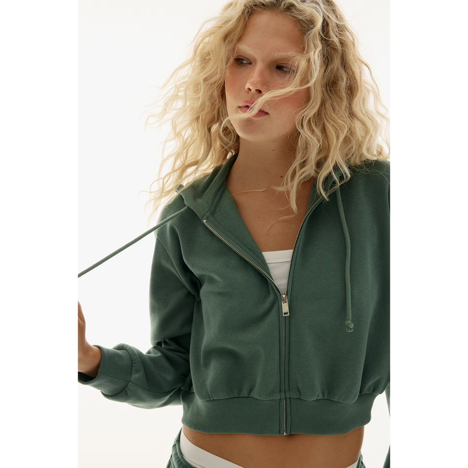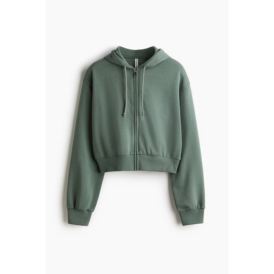 เสื้อฮู้ดผู้หญิงแบบมีซิปสั้นผ่อนคลายเสื้อฮู้ดผ้าฝ้ายสแปนเด็กซ์ป้องกันริ้วรอยย้อมเรียบ