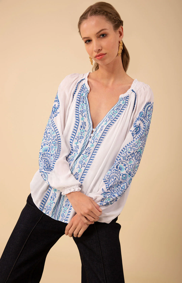เสื้อชาวนาปักทรงปกติพร้อมแขนกระพือสำหรับใส่ในสำนักงานซักได้และระบายอากาศได้ดีด้วยด้ายสีทองงาช้างที่สลับซับซ้อน