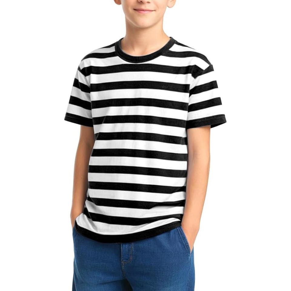 เสื้อยืดลายทางสำหรับเด็กผู้ชายที่ให้ความรู้สึกสบาย ผลิตจากผ้าฝ้าย 100% แขนสั้น พร้อมชายเสื้อหลังยาวขึ้นเล็กน้อยเพื่อการปกปิดระหว่างเล่น