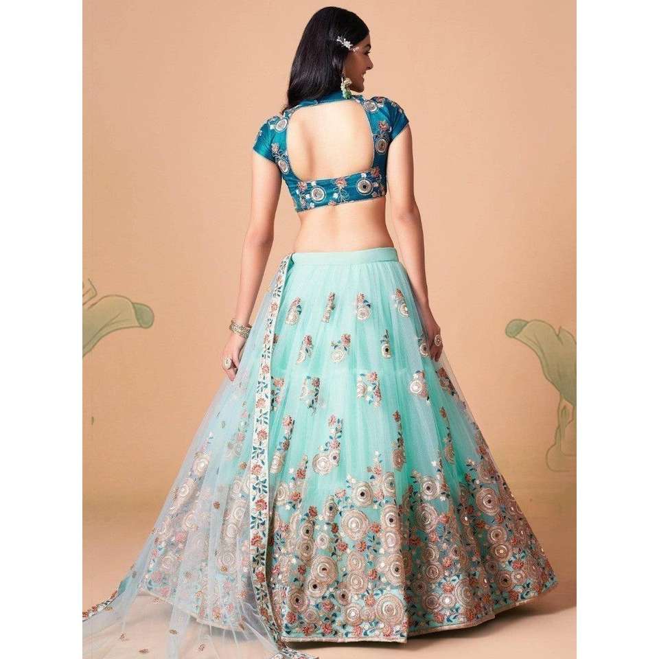 Lehenga choli กระโปรงทำงานตาข่ายสะท้อนแสงสีฟ้าสดใส