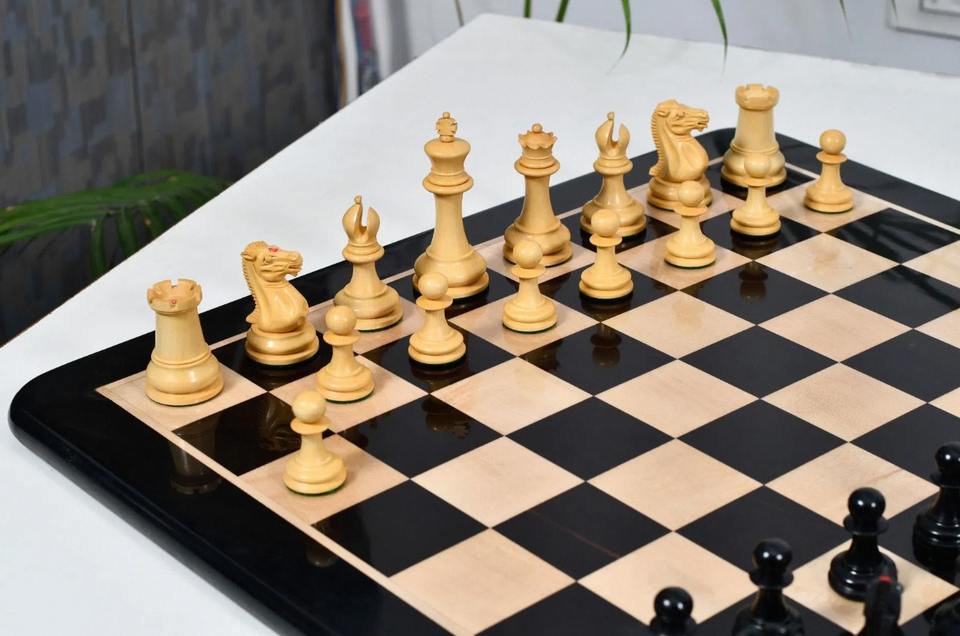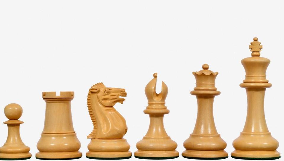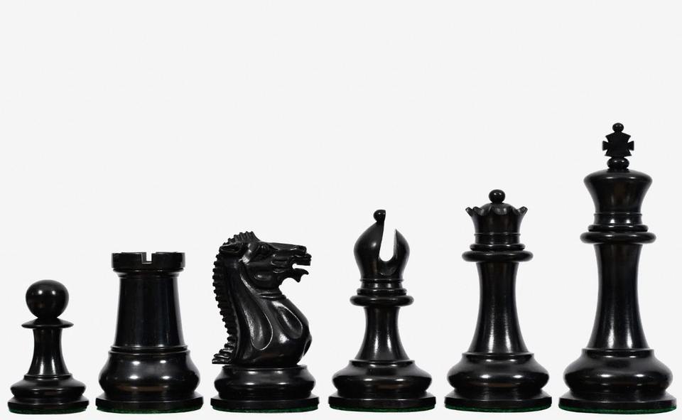 ชุดตัวหมากรุกแบบสเตนตัน ปี 1849 ทำจากไม้เนื้อแข็ง ไม้มะเกลือ และไม้บ็อกซ์วูด พร้อมตราประทับด้านข้างของกษัตริย์ ขนาดกษัตริย์ 3.75 นิ้ว