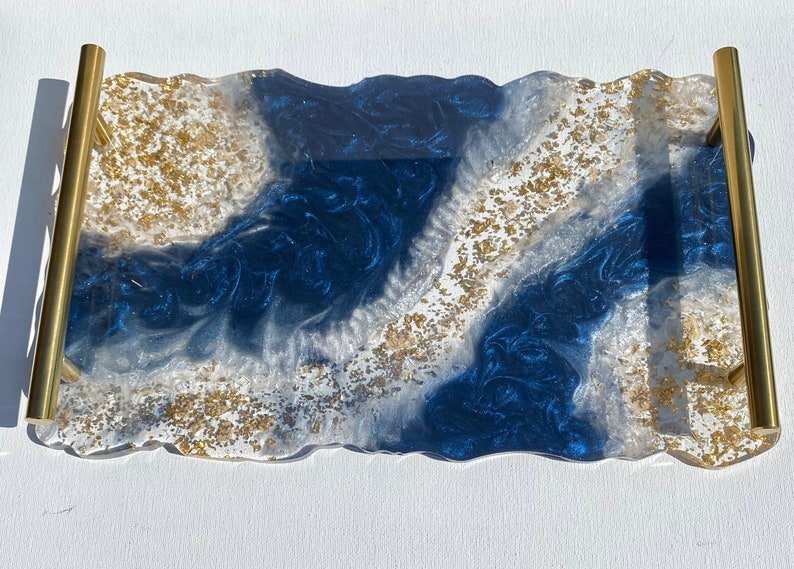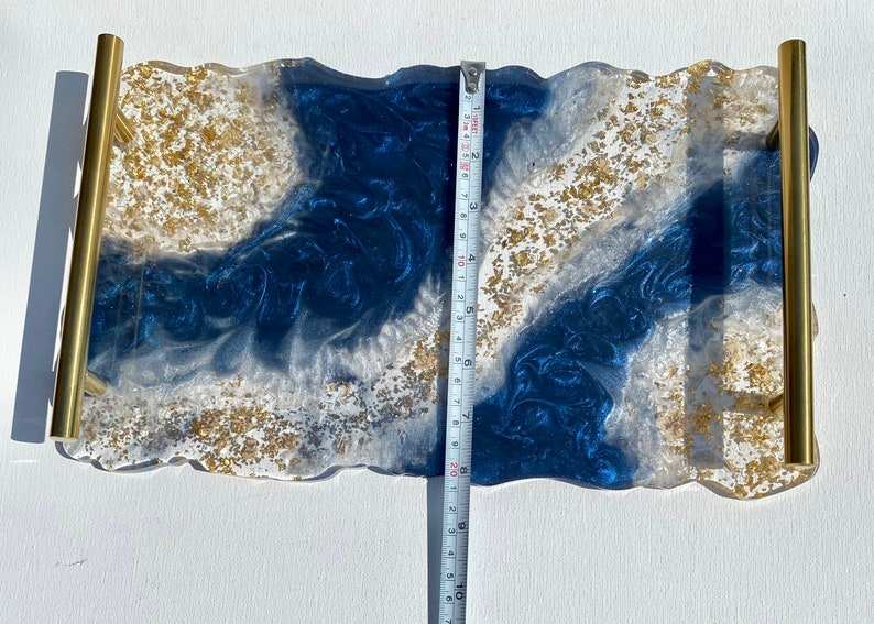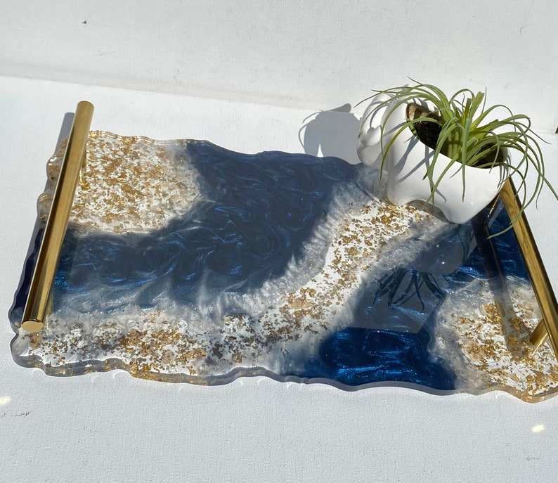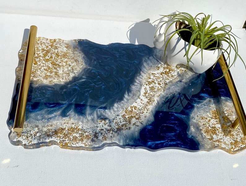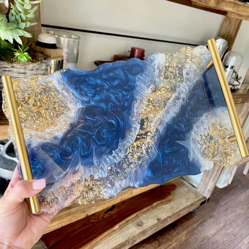 ถาดเรซิ่นลายจีโอด สไตล์อาเกต สีน้ำเงินเข้ม ถาดเสิร์ฟตกแต่งเรซิ่นพร้อมหูจับทองคำสไตล์โมเดิร์น