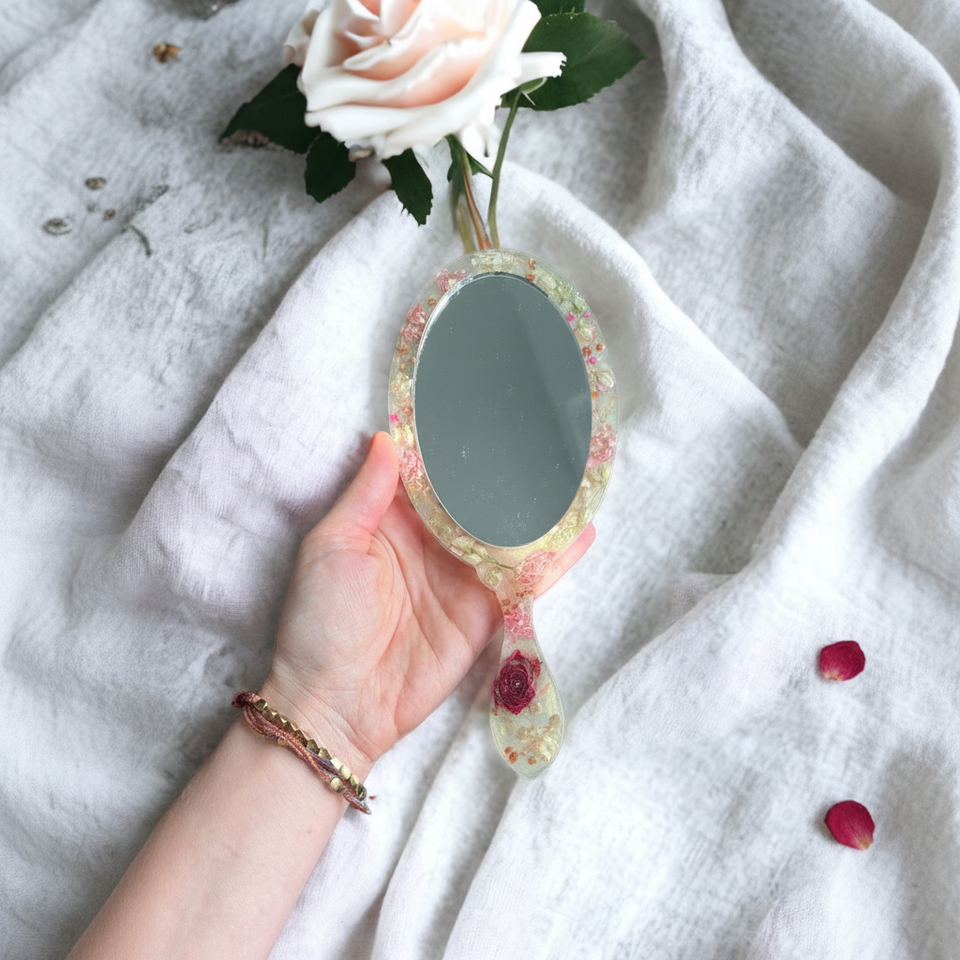 กระจกมือถือเรซิ่นเคลือบเงาเรียบเนียน เหมาะสำหรับการแต่งหน้าในชีวิตประจำวันหรือใช้เพื่อการตกแต่ง เพิ่มความมีสไตล์