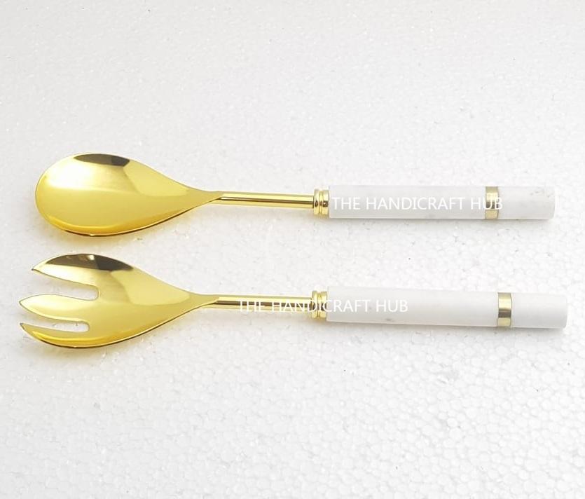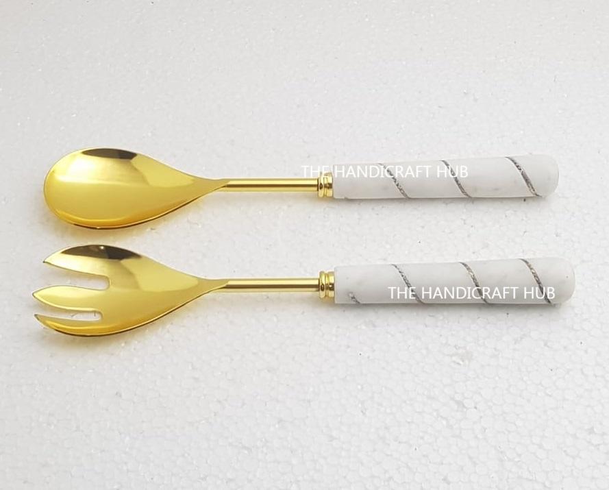 ชุดเสิร์ฟสลัดสแตนเลสพร้อมด้ามจับเรซิ่นและหินเทอร์ราซโซ ชุดช้อนและที่ตักสลัดโลหะสแตนเลสขนาดใหญ่