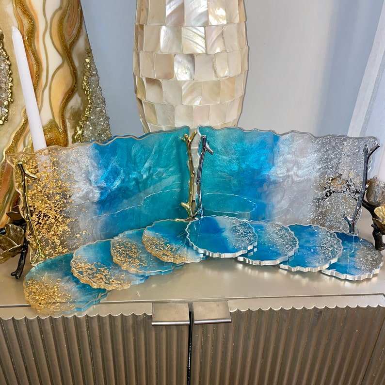 ชุดถาดรองแก้วเรซินถาดชายหาดถาดเรซิ่นพร้อมที่จับและชุดจานรองแก้วสีฟ้าและทองถาดตกแต่งเรซินทำมือ