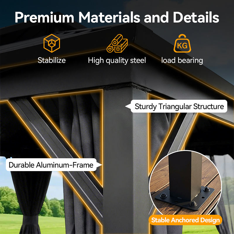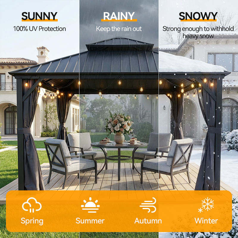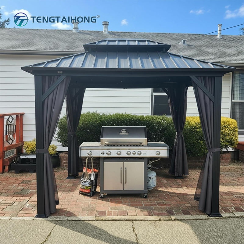 ศาลาพักผ่อนกลางแจ้งทรงรีสอร์ท โครงอะลูมิเนียม หลังคาแข็งแบบสองชั้น พร้อมม่านระบายอากาศ เหมาะสำหรับริมสระน้ำหรือลานบ้าน