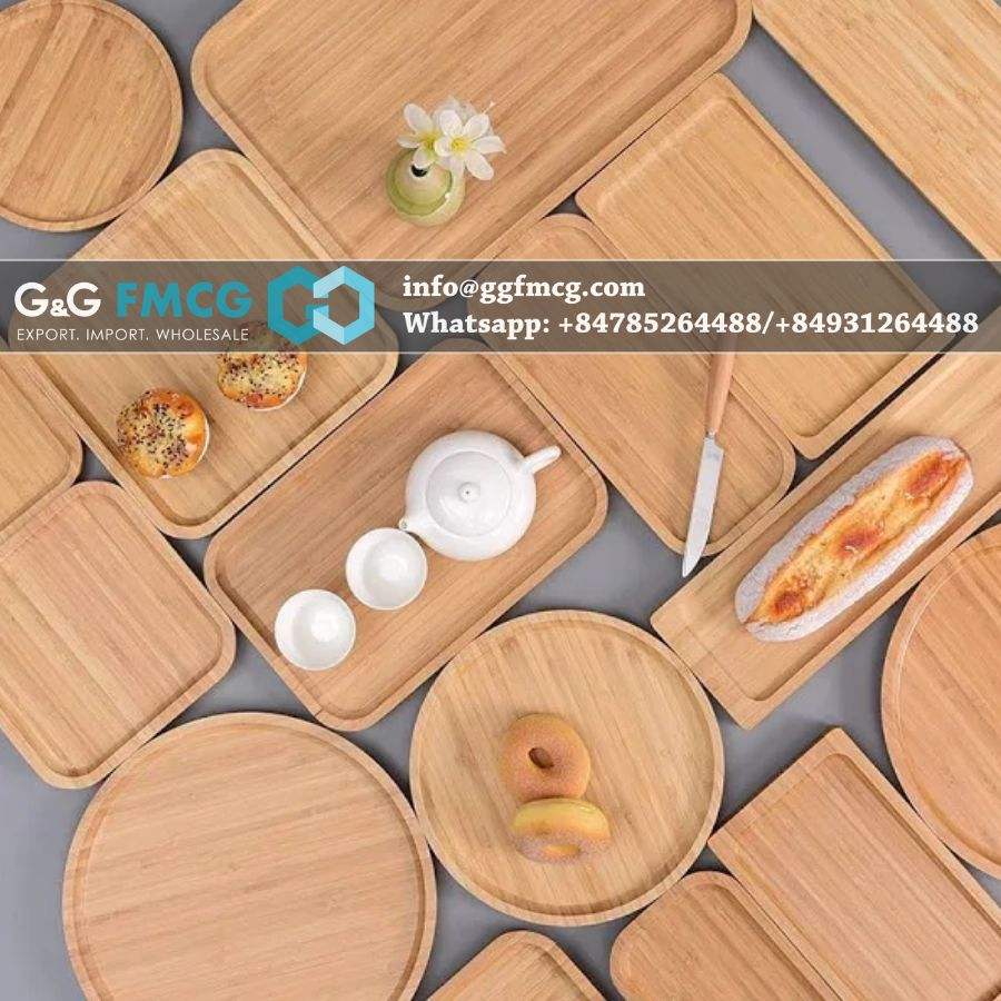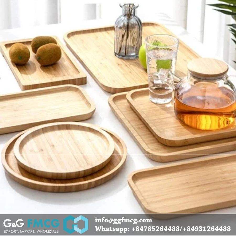 ถาดเสิร์ฟอาหารเช้า อาหารเย็น ผลไม้ ทำจากไม้ไผ่เคลือบเงา สำหรับร้านอาหาร โรงแรม รับทำโลโก้ เป็นมิตรกับสิ่งแวดล้อม ดีไซน์ทันสมัย