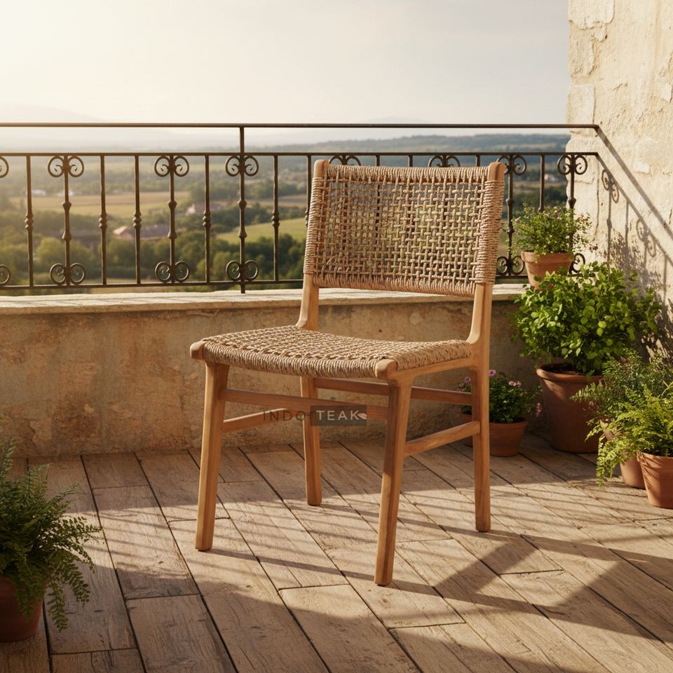 ชุดเฟอร์นิเจอร์ร้านอาหารพร้อมโครงไม้สักตกแต่งด้วยเชือกแข็งแรง รูปลักษณ์สวยงาม เหมาะสำหรับใช้งานได้หลากหลาย