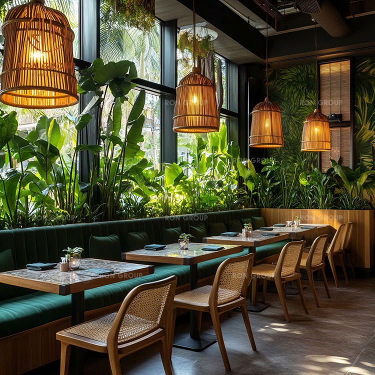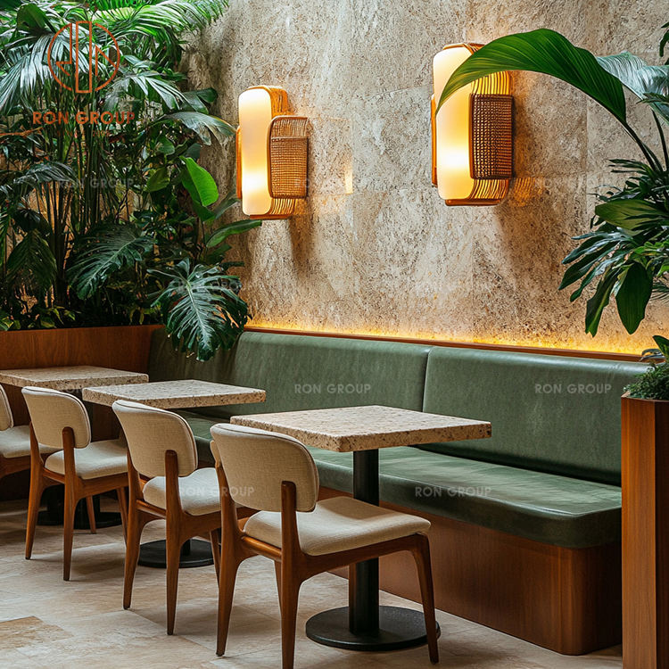ชุดเฟอร์นิเจอร์ร้านอาหาร โต๊ะร้านกาแฟไม้หน้าโต๊ะมีลวดลาย เก้าอี้ไม้พนักพิงหวาย และโซฟาผ้าสีเขียวสำหรับร้านกาแฟ