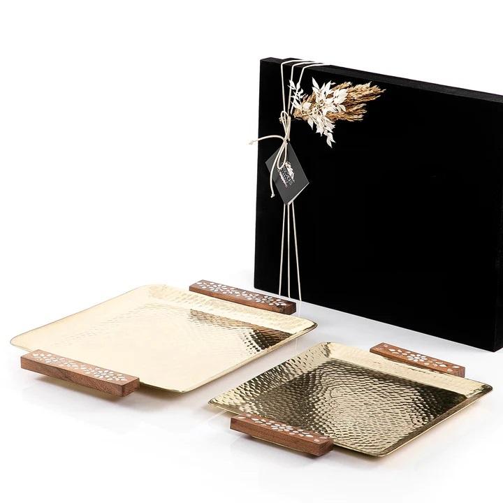ร้านอาหารเสิร์ฟถาดกาแฟพร้อมชุดถาดอลูมิเนียมตอกโลหะชุบทอง 2 ชิ้นพร้อมที่จับไม้ในราคาขายส่ง