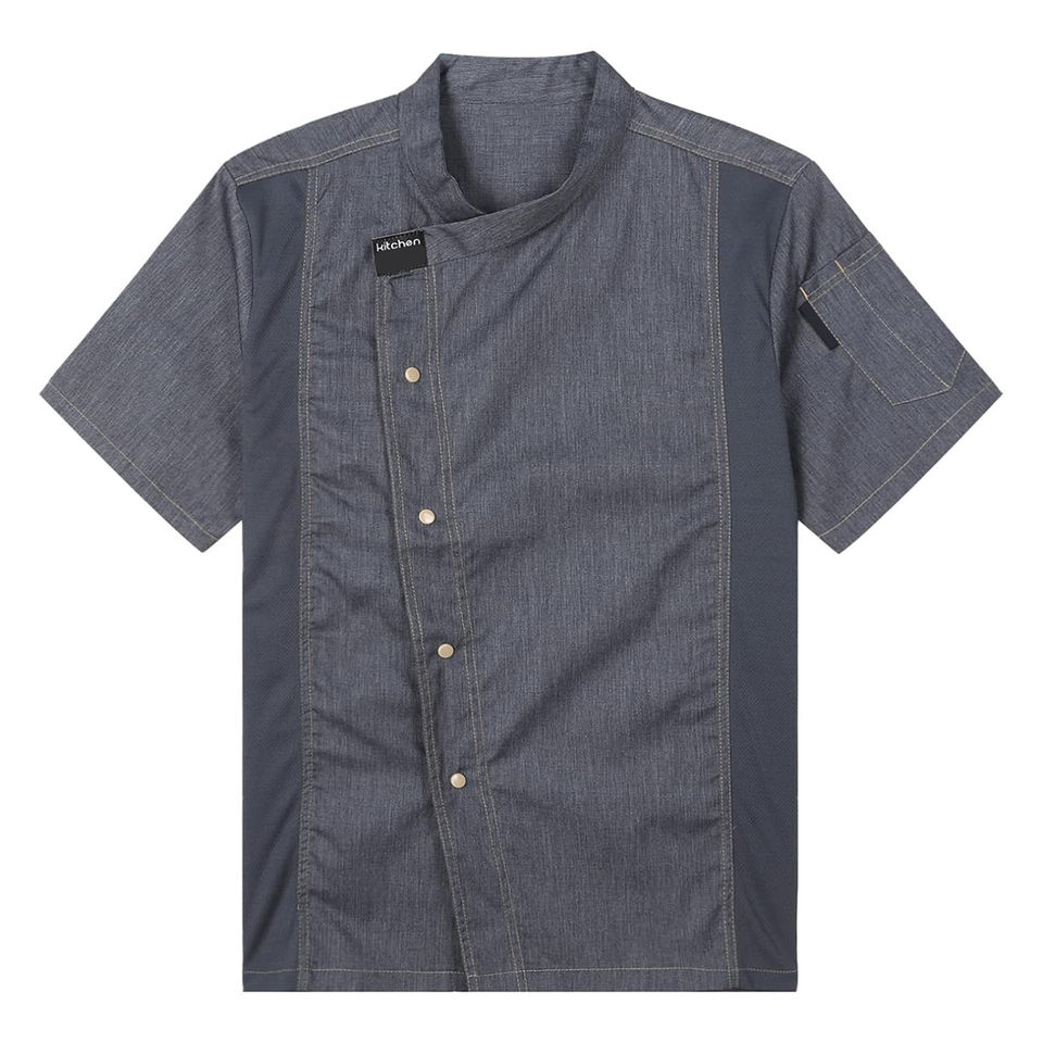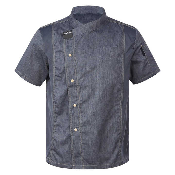 เสื้อเชฟทันสมัยสำหรับร้านอาหาร เสื้อเชิ้ตทำงานผู้หญิงผู้ชาย ป้องกันแสงแดด กระดุม 3 เม็ด เสื้อทำงานผู้ชาย ชุดยูนิฟอร์ม เสื้อเชฟ