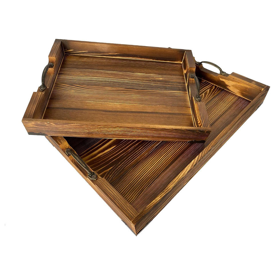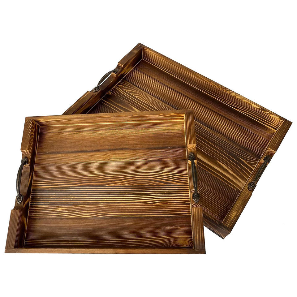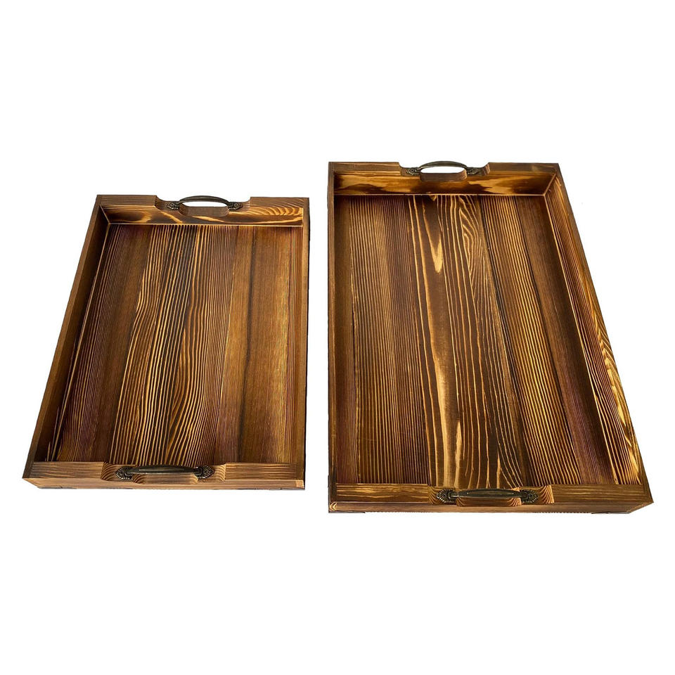 ซัพพลายเออร์ถาดไม้ระดับพรีเมียมสำหรับใช้ในโรงแรมร้านอาหารชุดถาดทำจากไม้สน2ชิ้นพร้อมที่จับโลหะวันนี้