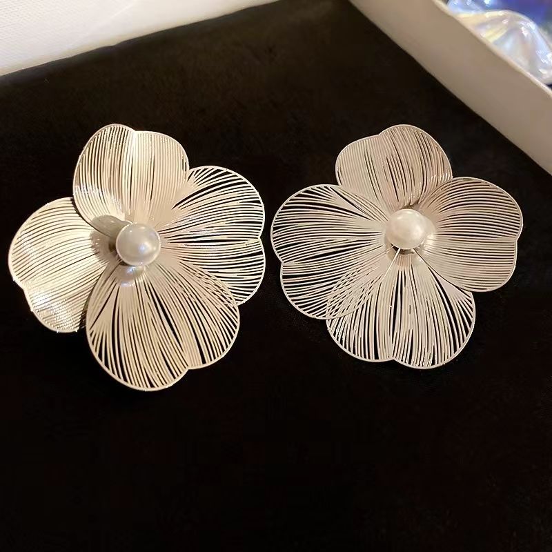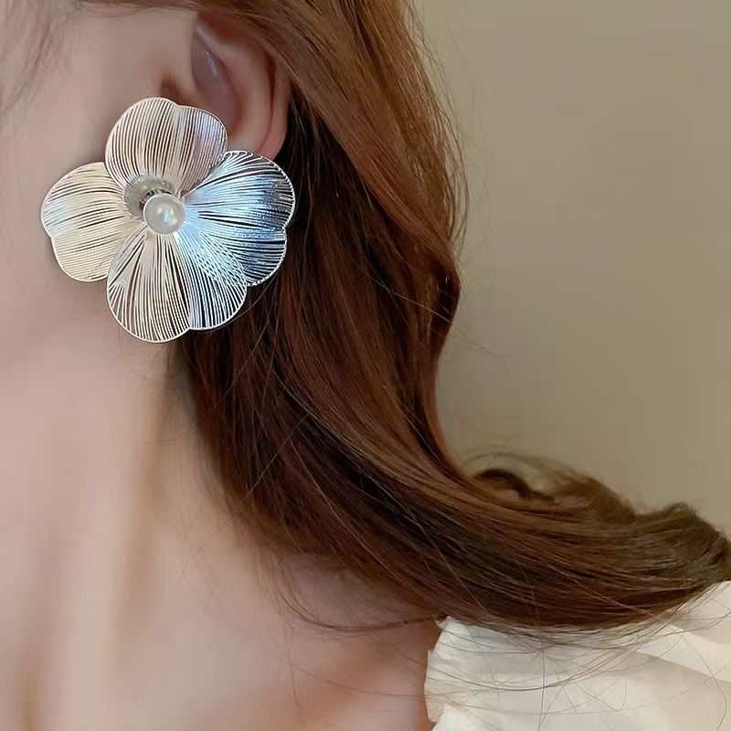 ต่างหูหมุดรูปดอกไม้ขนาดใหญ่ทำจากโลหะเข็มเงินสำหรับผู้หญิงหรูหรา