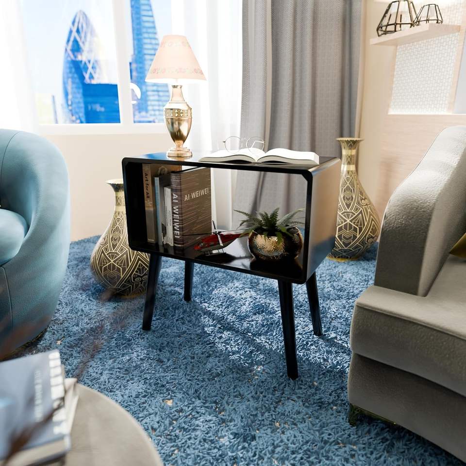 ตู้หนังสือสไตล์เรโทร โต๊ะข้างเตียง โต๊ะวางของข้างเตียงสำหรับพื้นที่ขนาดเล็ก ชั้นวางนิตยสารพร้อมที่เก็บของ ทำจากไม้เอ็นจิเนียร์