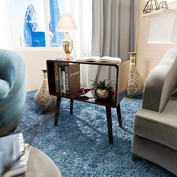 ตู้หนังสือสไตล์เรโทร โต๊ะข้างเตียง โต๊ะวางของข้างเตียงสำหรับพื้นที่ขนาดเล็ก ชั้นวางนิตยสารพร้อมที่เก็บของ ทำจากไม้เอ็นจิเนียร์
