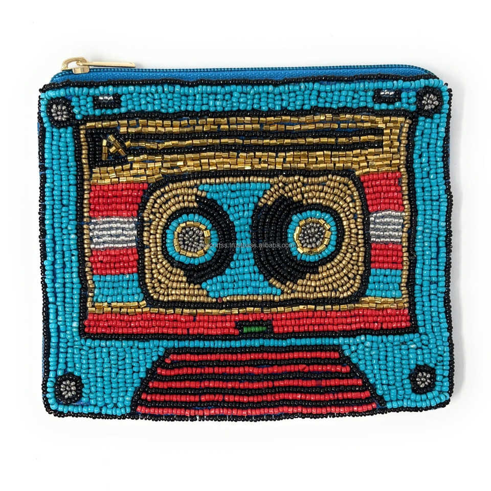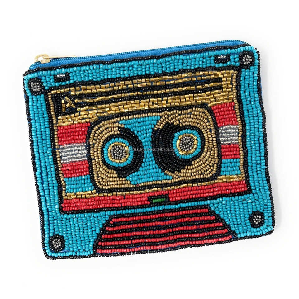 กระเป๋าใส่เหรียญทรงบูมบ็อกซ์ย้อนยุค ประดับลูกปัดสีน้ำเงิน งานฝีมือ กระเป๋าซิปทรงเทปคาสเซ็ต ปักลายดนตรี กระเป๋าเงินขนาดเล็ก ของขวัญ กระเป๋าคลัทช์ขนาดกะทัดรัด
