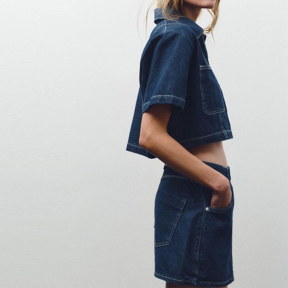 ชุดเซ็ตยีนส์ลำลองสไตล์เรโทรสำหรับผู้หญิง เสื้อแขนสั้นมีกระเป๋า กางเกงขาสั้น ใส่ได้ทั้งฤดูใบไม้ผลิและฤดูร้อน รับตัดตามสั่ง
