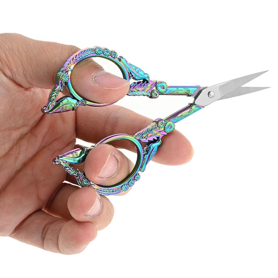 กรรไกรตัดหนังแบบวินเทจพร้อมปลอกหนังลายนูนรูปนก ขนาด 4.6 นิ้ว อุปกรณ์เย็บผ้า งานฝีมือ DIY ตัดด้าย เย็บผ้า